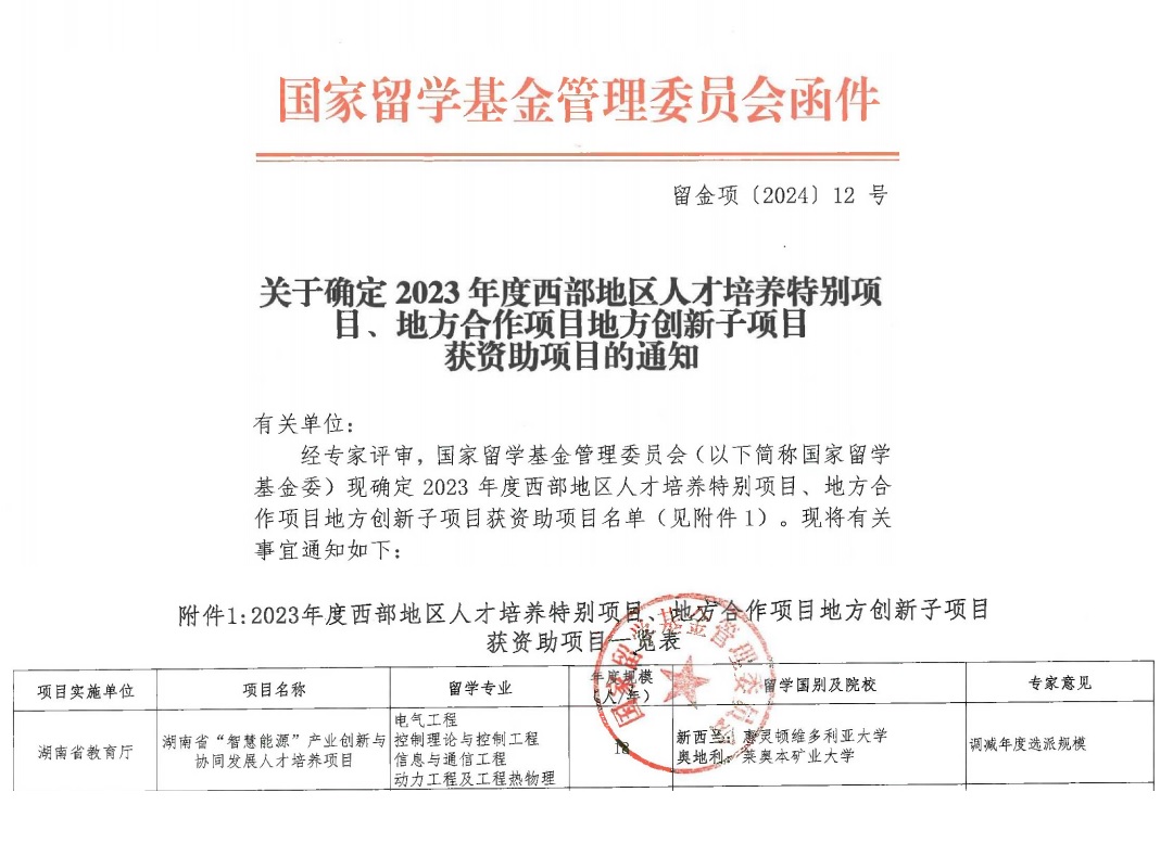 近日,由湖南省教育厅组织,beat365手机版官网入口牵头,联合湘潭大学和湖南科技大学共同申报的湖南省“智慧能源”产业创新与协同发展人才培养项目,正式通过国家留学基金委答辩,获得国家留学基金管理委员会“2023年度西部地区人才培养特别项目、地方合作项目地方创新子项目获资助项目”立项资助。