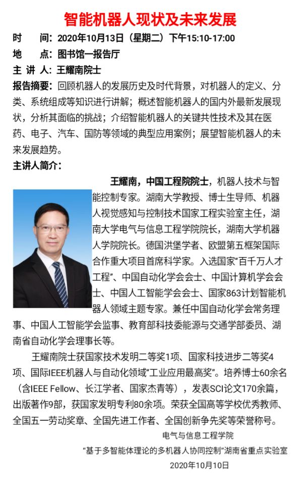 学术讲座:智能机器人现状及未来发展(王耀南,中国工程院院士)