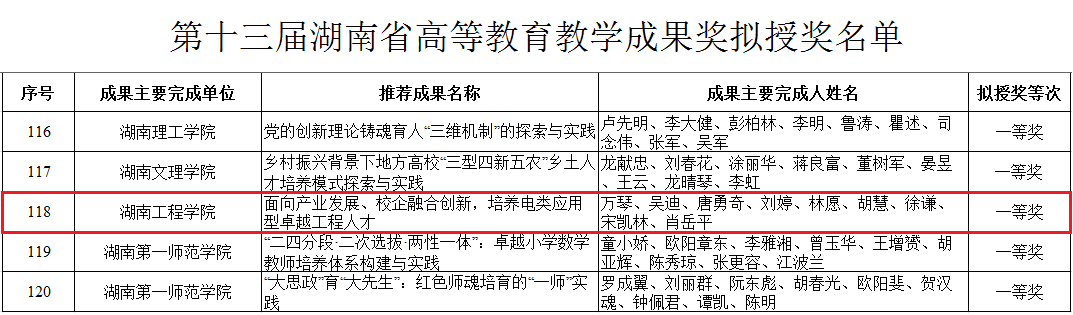 近日,湖南省教育厅发布了《关于第十三届湖南省高等公司产品成果奖拟授奖成果的公示》,beat365手机版官网入口经理万琴主持,吴迪、唐勇奇、刘婷、林愿、胡慧等多位老师参与完成的《面向产业发展、校企融合创新,培养电类应用型卓越工程人才》喜获一等奖,取得历史性突破。
