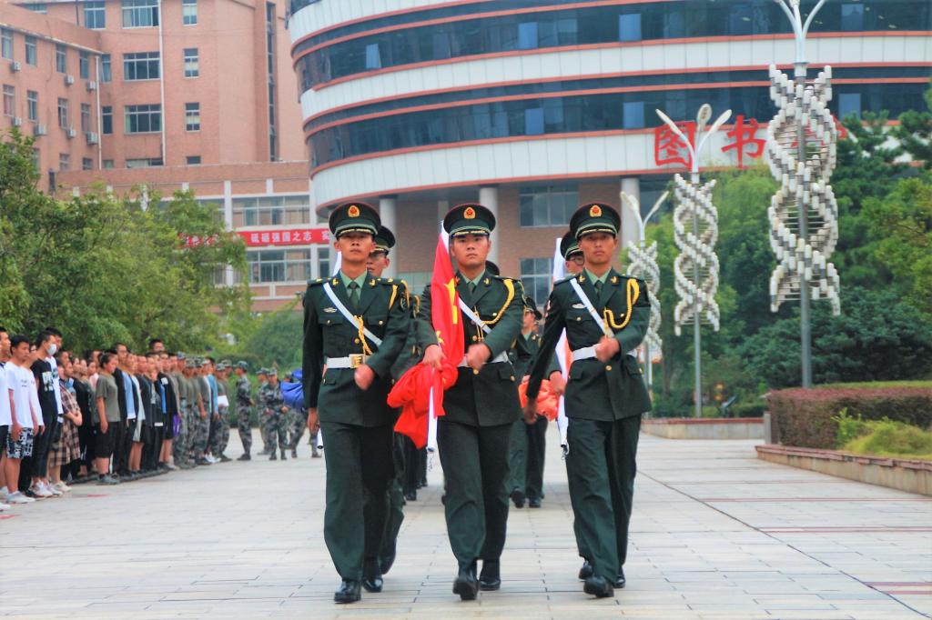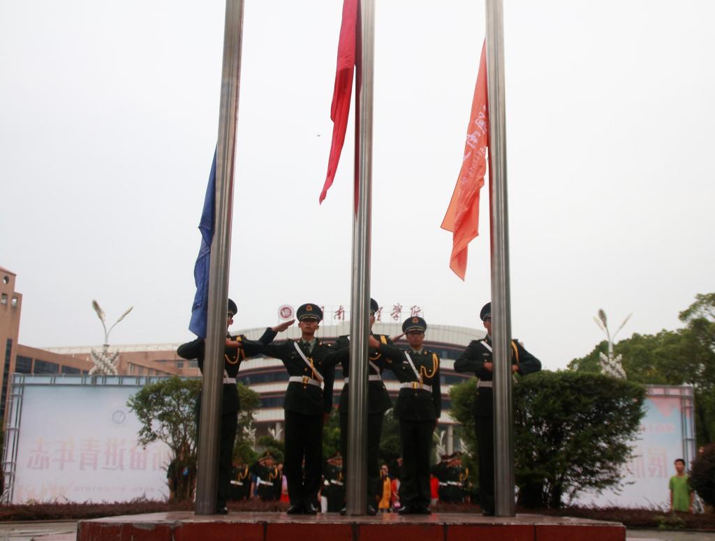 飒爽英姿的国旗护卫队队员迈着整齐划一、铿锵有力的步伐护送国旗走到升旗台。伴随着雄壮的国歌声,升旗手把国旗向上抛撒,全体师生脱帽肃立,注视着鲜艳的五星红旗缓缓升起。