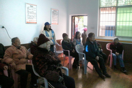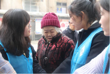 志愿者们亲切询问社区老人生活情况