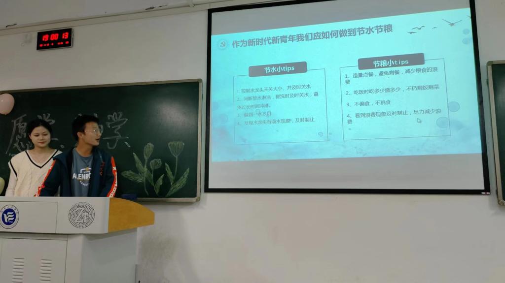班级从“为什么要节约?怎么去节约?”作为切入点,围绕节约这一主题,就当今社会铺张浪费现象引申到学习、生活等方面发起讨论。同学们积极参与,交流讨论改掉坏习惯的金点子和节约的小妙招,主讲人张依琪和唐扬呼吁同学们从现在做起,从节约一粒米、一滴水、一度电做起,齐心协力共建节约型校园。
