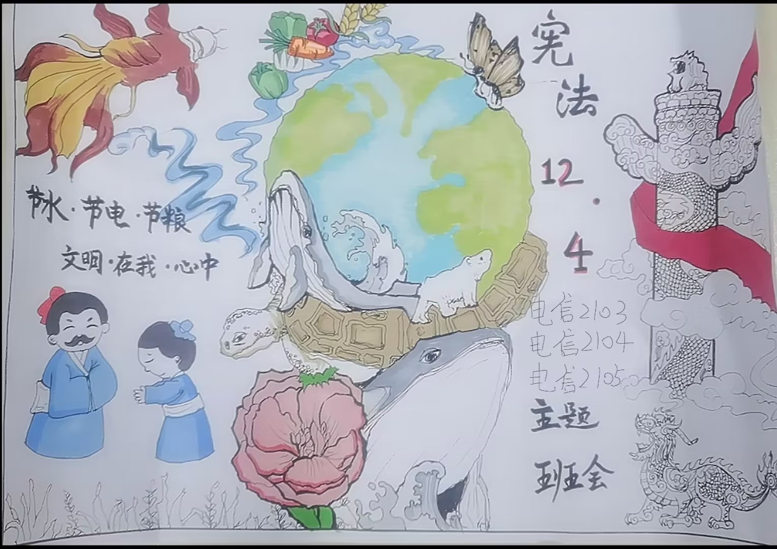 班会伊始,主讲人刘奕臻首先通过一段视频让同学们了解了当今资源紧缺的现状,引导同学们要养成节约的行为习惯,随后,组织同学们针对宪法作为国家根本法与普通法律有什么区别这个问题进行讨论,同时对同学们讨论过程中存在的疑问进行解答,引导同学们增强国家意识、法制意识和社会责任意识。最后设计文明礼仪“你画我猜”趣味小游戏,激发员工内心对文明礼仪的追求,争取做以德为先、以学为上的时代新人。