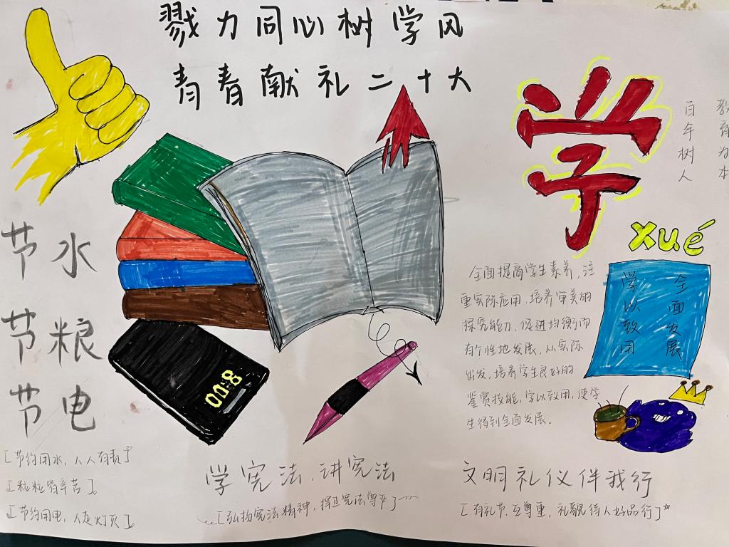 会前,班级群策群力,设计了活动主题展板、绘画宣传海报等进行活动预热营造浓郁活动氛围。会上,设计宪法、文明礼仪知识有奖竞答和倡议宣读等环节进一步提高班上同学的参与度。会后开展光盘打卡行动,身体力行,同学们用实际行动诠释了节约粮食的意义。