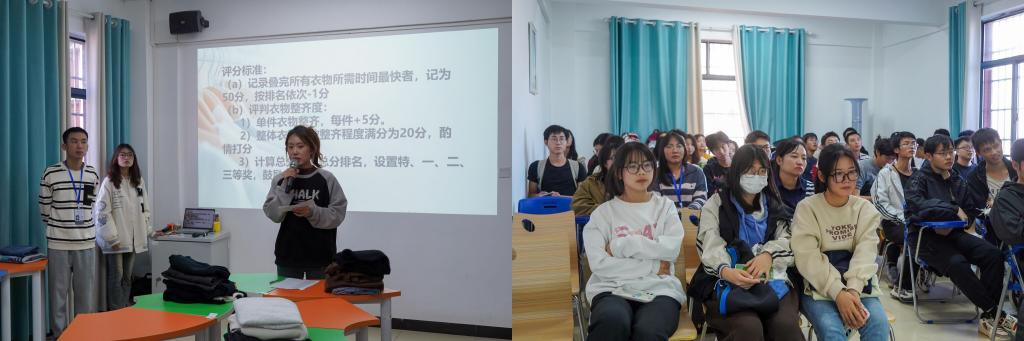 在比赛环节,每位同学争分夺秒、一丝不苟地将一堆杂乱的衣服前折、后叠、巧塞。测控技术与仪器2301班的陈一涵同学说:“这次比赛不仅锻炼了叠衣技能,还让我学会了如何在紧张的学习生活中找到放松的方式。”在比赛过程中,有些参赛者最终堆叠起的衣服井然有序,如同艺术品一般;有些参赛者手法熟练快速折叠,同时兼顾好效率与质量。许多参赛选手表示,叠衣服的过程让他们暂时忘记了学业压力,心情变得轻松愉悦。