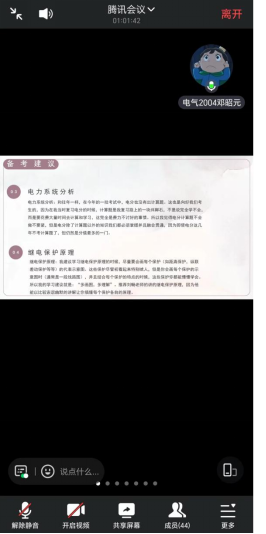 随后,邓昭元同学分别从国网考试内容、网申情况、备考建议和经验分享等四个方面向大家分享经验,并将国网考试中所需要学习的七本书依次向大家介绍,把每本书的重点难点和自己的复习方法都分享给大家,使同学们对于国网考试的难度和主要内容都有了更深刻的了解。介绍完考试方面内容后,邓昭元同学将自己备考期间所得出来的经验与复习计划跟大家做分享,让同学们大致清楚了备考的各个阶段需要完成的目标,经验分享完毕后,同学们积极提问,邓昭元同学一一回答同学们的问题,解决同学们心中的疑惑。活动的最后,邓昭元同学将自己备考期间的所有资料都整理好并且分享给同学们。