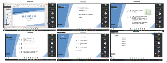 刘雨露同学则是以自身备考经验分享为大家进行了分享,她以考研高数、英语、政治及其专业课等科目全年学习规划依次向大家介绍。在考研高数的学习上,她讲述了该学科的重要性和学习、考试难度,其学科难点在于题目的多变性、新颖性,强调了多刷题,培养快速理解题意、提取题目考点的能力;在考研英语学科上,采用书本与单词软件结合,学习单词和语法,每日定时并辅以充分利用碎片化时间记忆的学习方法;对于政治学科的学习上,对考试易丢分、拉分的题型提供了学习思路;在专业课学习分享中,她为大家提供了学习的四个阶段框架,为大家更好地规划和安排自己的学习过程,提高学习的效率和质量。