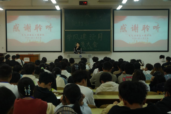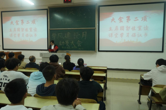 随后,学习部李好向大家介绍了本次学风建设系列活动,包括“我为评估做件事”主题班会、“学科经验分享会”、“学业帮扶活动”、“研梦起航,智海扬帆”考研规划讲座、电气楼学风长廊参观等多项活动,还为同学们介绍了关于优秀班级评选的条件,以此来引导同学们更加重视班级学风建设,积极参与学习活动,共同营造良好学习氛围。