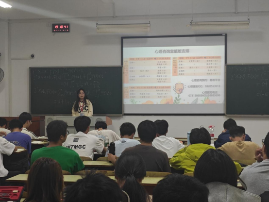 随后,各班级主持人介绍了心理健康教育与咨询中心地址、咨询预约电话、各校区心理咨询室地址和值班时间、易班APP上的心理咨询预约方法,宣传了“beat365手机版官网入口学工在线”微信公众号。