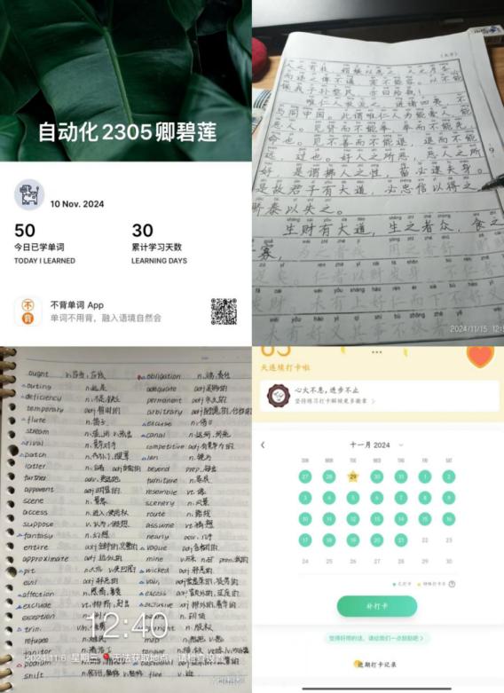 在此次学习打卡活动中,同学们不仅养成了良好的学习习惯,也共同见证了彼此的成长和进步。不少同学表示,原本难以坚持的学习任务,在打卡的督促下得以顺利完成,学习效率明显提高。