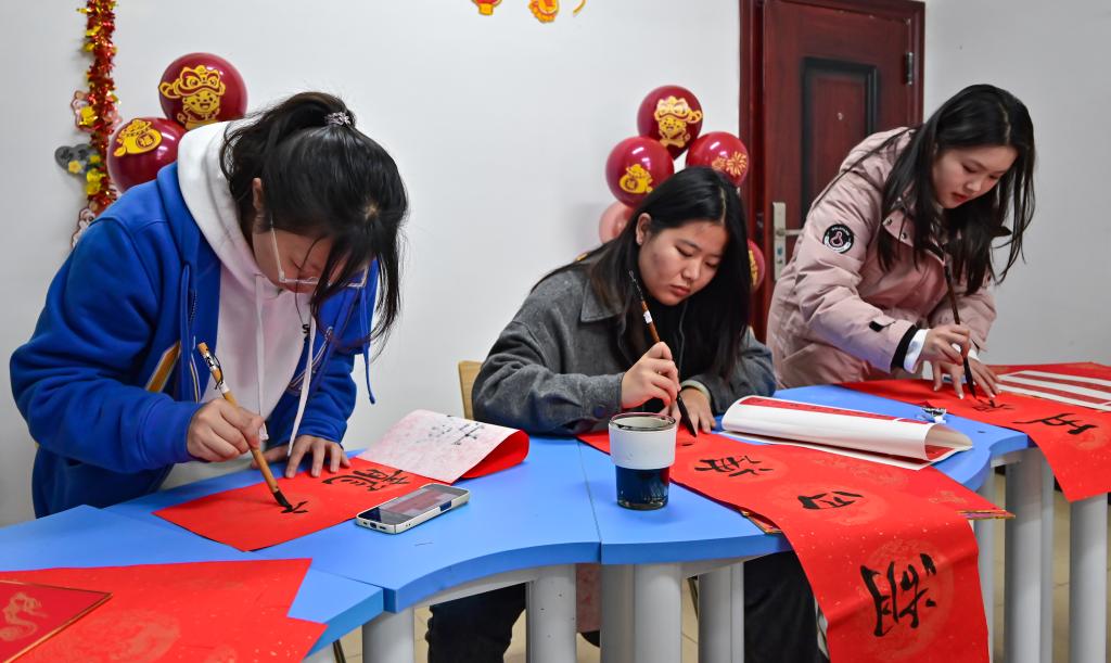 翰墨飘香迎龙年,书写浓情送祝福。活动现场,笔墨纸砚一字排开,同学们热情高涨,蘸好笔墨,凝神聚气,一副副寓意吉祥的春联跃然纸上:“妙音龙吟腾四海,清音凤舞会三春”“春临大地花开早 福满人间喜事多”……大家纷纷表示,手写的春联才更有年味,这份具有“特色”的新春礼物,让他们感受到传统的年味和节日的喜庆。