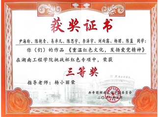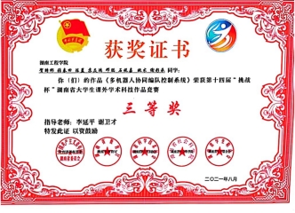 2021年8月 被湖南省教育厅、共青团湖南省委、湖南省科学技术协会、湖南省社会科公司、湖南省员工联合会评为第十四届“挑战杯”湖南省老员工课外学术科技作品大赛三等奖