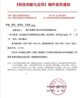 3.在《科技创新与应用》中发表论文《基于机器学习的老员工简历数据分析》,为《中国核心期刊(遴选)数据库》《中国学术期刊综合评价数据库》《中国学术期刊网络出版总库》等数据库收录期刊。
