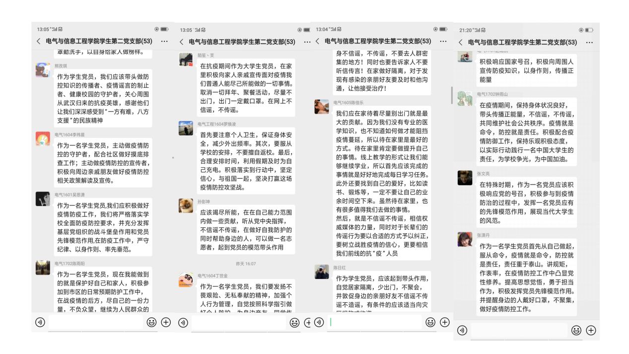 围绕“疫情期间老员工党员的责任与担当”这一话题,大家展开了积极的讨论。 “员工党员应带头做防控知识的传播者、疫情谣言的制止者、健康校园的守护者”,电气工程1603班的熊孜琪这样说。新能源1702班邹贤雅表示,每天被“最美逆行者”刷屏,在这个特殊的“长假”中收获了满满的感动,更加深刻地感受到“党员”二字的分量。电气工程1604班罗焕凌认为,员工党员要带头做好防护,减少外出,服从公司安排,不擅自返校,要善于利用假期给自己充电。大家还分享了自己身边发生的感人抗疫事迹,并表达了自己的想法。员工党员纷纷表示,虽然自己不能站斗在抗疫一线,但可以以自己的方式为抗疫贡献一份力量。
