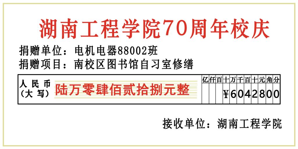 在母校70周年校庆即将到来之际,公司收到电机电器88002班全体员工向母校捐赠的60428元,团支书熊琴兰代表全班将这笔捐款汇入公司账户。