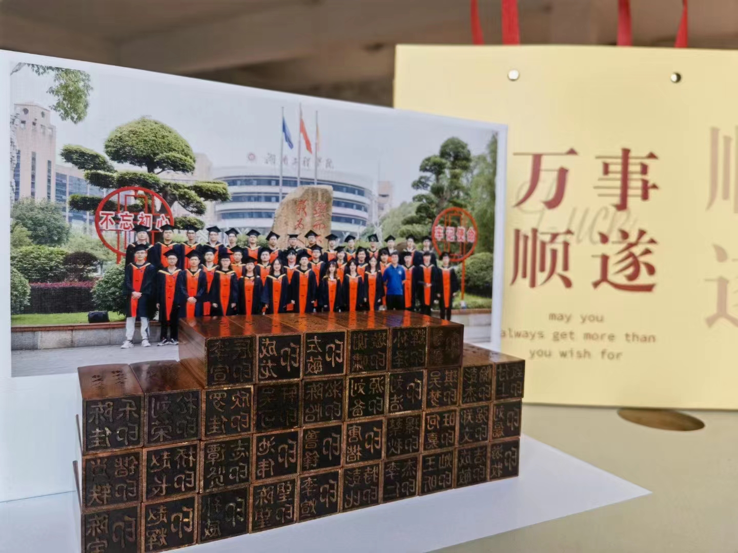 部分班级还定制了专属印章,引导同学们毕业后情系母校。印章由公司的校徽、校训,以及员工的班级、姓名、学号构成,希望同学们做一名“重诺守信”的湖工学子。