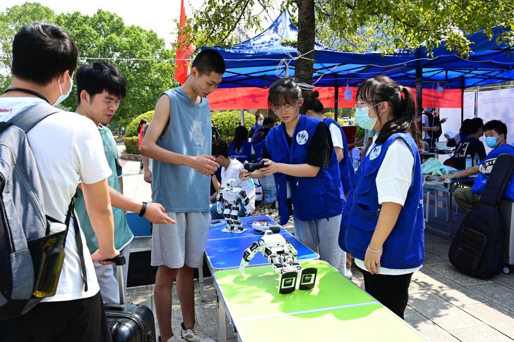 迎新志愿者们引领新生完成了注册报到、领取军训服装票、办理入住等一系列手续,冒着炎炎烈日,志愿者们为新生解疑答惑,频繁穿梭于迎新点和寝室,帮助新生搬运行李。整个迎新过程有序进行,使新生一入校就感受到了公司满满的关爱。迎新现场的无人机、智能机器人闪亮登场,招手、翻跟头、做俯卧撑,机器人的精彩“表演”吸引了新生驻足观看,还一些新同学饶有兴趣地上前动手操作,亲身体验科技创新的魅力。