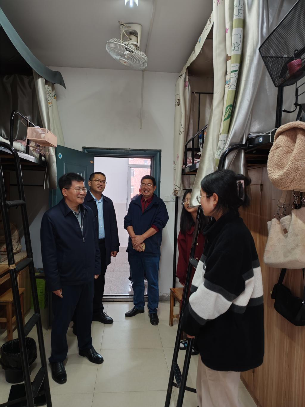 11月25日下午,董事长易兵一行前往beat365手机版官网入口2022级新生集中居住的滨江1栋、4栋员工宿舍进行走访,同大一新生进行交谈,了解同学们的学习、生活情况,表达对员工的关切。