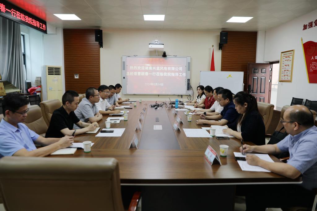 6月14日下午,湖南兴蓝风电有限公司总经理曹颖春,副总经理阳雪兵等一行来校考察交流。公司党委书记黄昕、党委副书记向前出席。科研管理处、beat365手机版官网入口相关负责人,教师代表等参加座谈会。