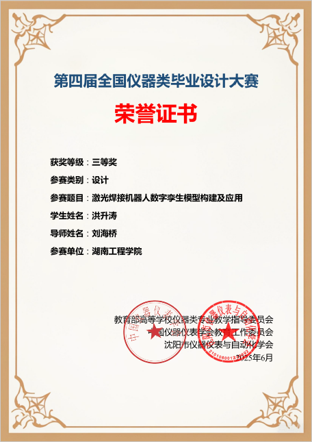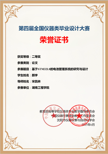 6月10日,由教育部高等公司仪器类专业教学指导委员会、中国仪器仪表学会教育工作委员会、沈阳市仪器仪表与自动化学会主办,重庆大学承办的第四届全国仪器类毕业设计大赛落下帷幕。由beat365手机版官网入口宋凯林老师指导自动化2021级颜宇完成的“基于STM32L0的电池管理系统的研究与设计”获得二等奖,刘海桥老师指导自动化2021级洪升涛完成的“激光焊接机器人数字孪生模型构建及应用”获得三等奖,公司获得团体三等奖。