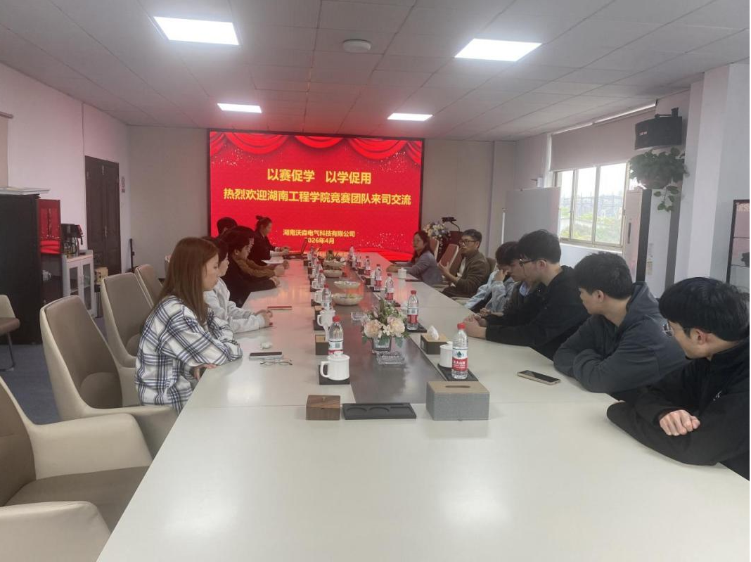 湖南沃森电气科技有限公司董事长尹书虎携公司技术骨干热情接待公司师生,陪同参观企业生产车间,并主持交流座谈会。尹书虎介绍了公司发展历程、核心业务、技术研发成果及行业前景,重点说明企业在电子信息领域的人才需求的标准,希望以此次交流为契机,加强与公司在竞赛备赛、实习基地建设、科研攻关等方面的合作,实现校企优势互补,共同培养行业急需的应用型人才。
